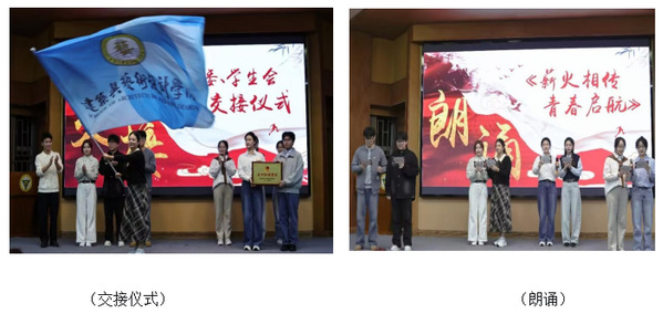随后进行的分团委学生会换届仪式上,分团委书记江晶老师为上一届学生干部颁发荣誉证书,并宣读新一届学生会干部任命名单。上一届分团委副书记张正扬和执行主席张豪杰分别上台将象征着服务同学、奉献校园的“五四红旗团委牌匾郑重交予新一届学生干部。新一届学生干部通过集体朗诵《薪火相传,青春启航》,承诺将秉持初心、务实笃行,为构建更加团结向上的校园氛围贡献青春力量。