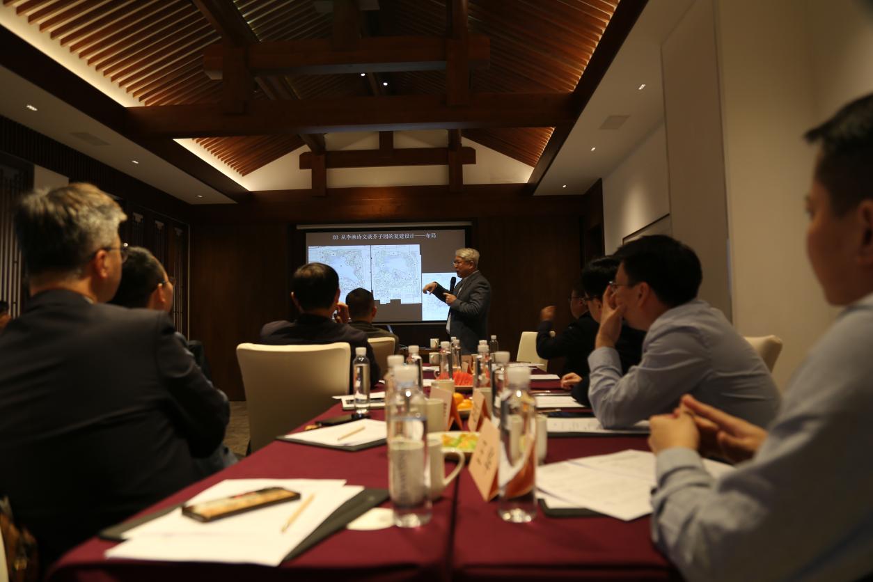 杨冬辉院长首先作了题为《园林艺术与文化的融合探索——从李渔诗文谈南京芥子园复建设计》的讲座,不仅追溯了明清园林文化的璀璨星河,精心提炼其独特韵味与时代风貌,从而为芥子园的复建设计铺设了厚重的文化底蕴,还细腻解读了李渔的诗文与生平,字里行间透露出的文人情怀与生活哲学,从而成就了芥子园设计灵魂的不竭源泉。他巧妙推演了芥子园的布局构思,每一砖一瓦、一草一木皆蕴含着深意,展现了中国古典园林“虽由人作,宛自天开”的至高境界。他认为,叠石引水技法的娴熟运用,不仅重现了芥子园的自然之美,更将园林艺术与文化精髓巧妙融合,赋予其新的生命与活力。