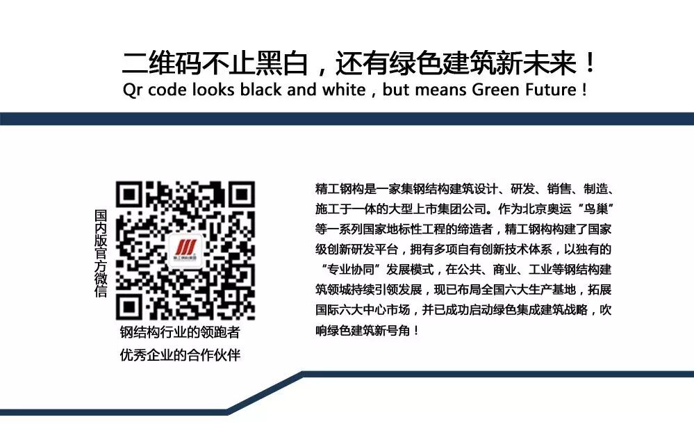 长江精工钢结构(集团)股份有限公司(以下简称“精工钢构”)是一家集国际国内大型建筑钢结构、钢结构建筑及建筑金属屋面墙面等设计、研发、销售、制作、施工于一体的大型上市集团公司,在全国钢结构行业排名中连续六年蝉联第一。作为 “北京奥运鸟巢、全球第一高的沙特国王塔”的承建商,精工钢构不断跨越发展,构建了国家级创新研发平台,拥有多项自有创新技术体系,成功塑造了“精工品牌”。独有的“专业协同”发展模式,让集团在公共、工业、集成、屋面等钢结构建筑领域持续引领发展,成功塑造“精工”、“美建”、“精锐”、“绿筑”母子品牌。
